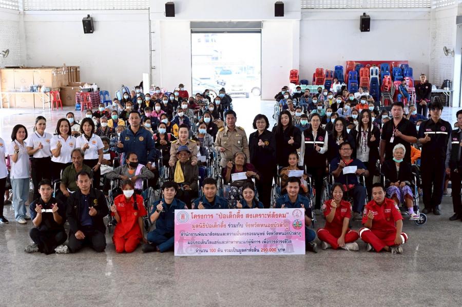 มูลนิธิป่อเต็กตึ๊ง ขยายความช่วยเหลือผู้พิการด้อยโอกาส มอบรถเข็นวีลแชร์พร้อมค่าพาหนะแก่ผู้พิการ 100 คน ในพื้นที่จังหวัดหนองบัวลำภู เพื่อถวายเป็นพระราชกุศลแด่สมเด็จพระนางเจ้าสิริกิติ์ พระบรมราชินีนาถ พระบรมราชชนนีพันปีหลวง ณ ที่ว่าการอำเภอเมืองหนองบัวลำภู อำเภอเมือง จังหวัดหนองบัวลำภู