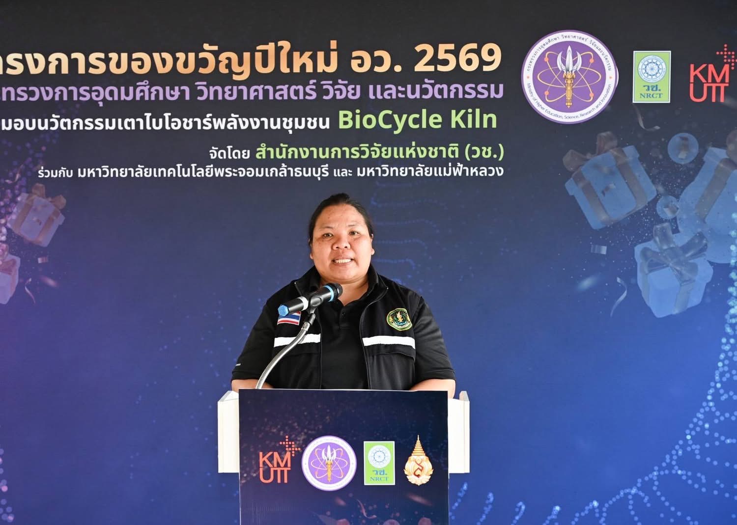 ดร.วิภารัตน์ ดีอ่อง ผู้อำนวยการสำนักงานการวิจัยแห่งชาติ กล่าวว่า อว.ได้ให้ความสำคัญกับการนำนวัตกรรมสู่การใช้ประโยชน์ ซึ่งโครงการของขวัญปีใหม่ อว.2569 วช.ได้นำนวัตกรรมเตาไบโอชาร์พลังงานชุมชน BioCycle Kiln เป็นผลงานที่ วช. ให้การสนับสนุนแก่มหาวิทยาลัยเทคโนโลยีพระจอมเกล้าธนบุรี ร่วมกับมหาวิทยาลัยแม่ฟ้าหลวง นำองค์ความรู้จากงานวิจัยมาพัฒนาเพื่อตอบโจทย์การจัดการเศษวัสดุเหลือทิ้งทางการเกษตรให้เกิดประโยชน์ ควบคู่กับการช่วยลดปัญหามลพิษทางอากาศ ฝุ่นละอองขนาดเล็ก PM2.5 และลดผลกระทบต่อสุขภาพของประชาชน ทั้งนี้ งานวิจัยและนวัตกรรมในการพัฒนาชุมชนอย่างยั่งยืน ถือเป็นโอกาสอันดีในการส่งมอบเป็นของขวัญปีใหม่ให้กับประชาชน ภายใต้โครงการของขวัญปีใหม่ อว. 2569