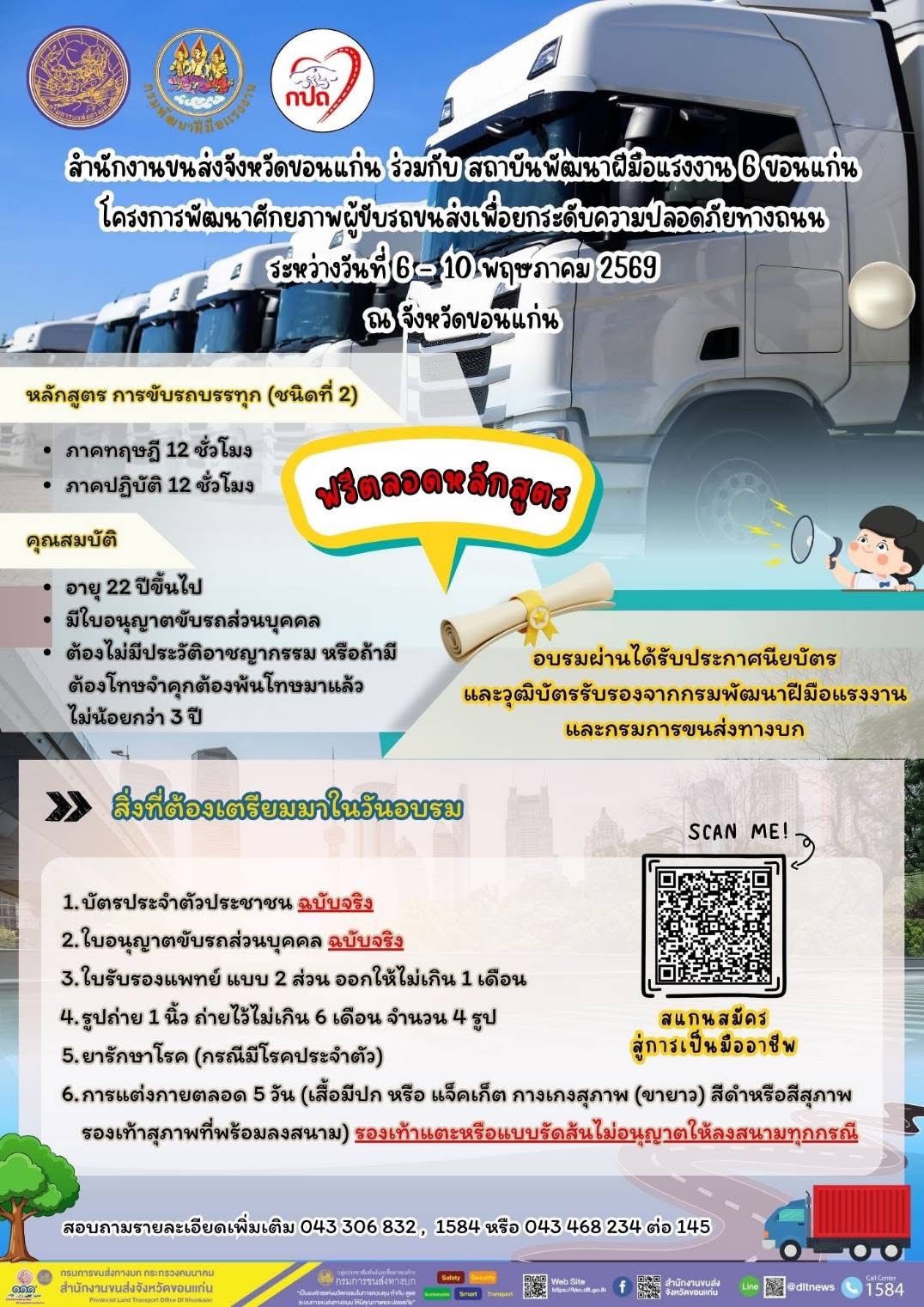 สำหรับคุณสมบัติผู้สมัครต้องอายุ 22 ปีขึ้นไป มีใบอนุญาตขับรถส่วนบุคคลสำหรับหลักสูตร ท.2 และใบอนุญาตขับรถชนิด ท.2 สำหรับหลักสูตร ท.3 ต้องไม่มีประวัติอาชญากรรม (หากเคยมี ต้องพ้นโทษมาแล้วไม่น้อยกว่า 3 ปี) สนใจสอบรายละเอียดเพิ่มเติมได้ที่สายด่วนกระทรวงแรงงาน 1506 กด 4 กระทรวงแรงงาน 1506 กด 4 หรือ Facebook: กรมพัฒนาฝีมือแรงงาน และ Facebook : โรงเรียนการขนส่ง by DLT แอปพลิเคชัน Line : @dlt.truck และหมายเลขโทรศัพท์ 02-271-8624