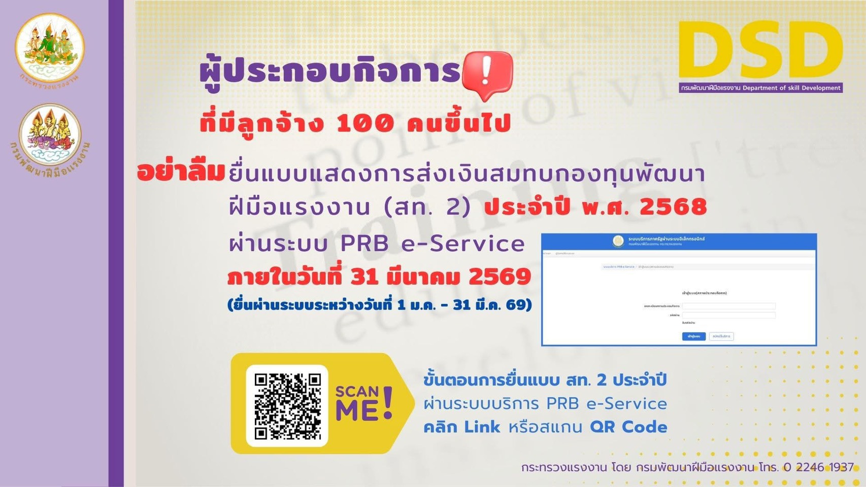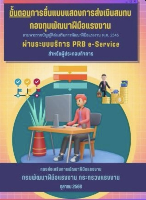 กรมพัฒนาฝีมือแรงงาน เตือนสถานประกอบกิจการ (100 คนขึ้นไป) ต้องยื่นแบบแสดงการส่งเงินสมทบกองทุนพัฒนาฝีมือแรงงาน ประจำปี 2568 ผ่านระบบ PRB e-Service ภายในวันที่ 31 มีนาคม 2569 นี้