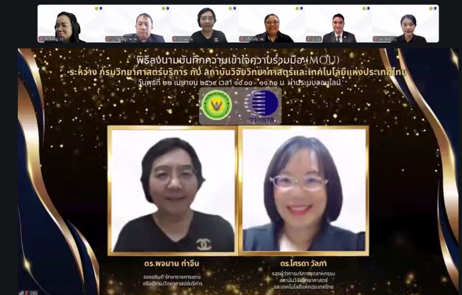 วันที่ 22 เมษายน 2569 กรมวิทยาศาสตร์บริการ (วศ.) กระทรวงการอุดมศึกษา วิทยาศาสตร์ วิจัยและนวัตกรรม (อว.) จัดพิธีลงนามบันทึกความเข้าใจ (MOU) ร่วมกับ สถาบันวิจัยวิทยาศาสตร์และเทคโนโลยีแห่งประเทศไทย (วว.) โดยมี ดร.พจมาน ท่าจีน รองอธิบดี รักษาราชการแทน อธิบดีกรมวิทยาศาสตร์บริการ และ ดร.โศรดา วัลภา รองผู้ว่าการบริการอุตสาหกรรม ผู้แทน ผู้ว่าการสถาบันวิจัยวิทยาศาสตร์และเทคโนโลยีแห่งประเทศไทย ร่วมลงนาม พร้อมด้วยคณะผู้บริหาร บุคลากรจากทั้งสองฝ่ายร่วมเป็นสักขีพยาน ผ่านระบบออนไลน์ (Zoom) วัตถุประสงค์เพื่อยกระดับการให้บริการทดสอบและสอบเทียบของประเทศให้มีคุณภาพและได้มาตรฐานสากล