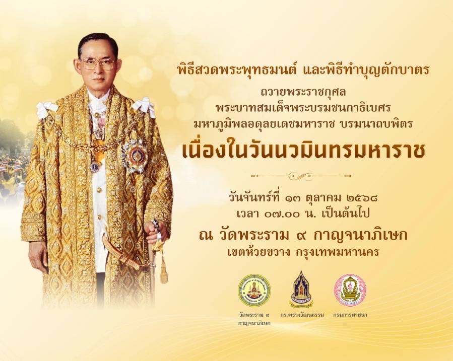 วธ. เตรียมจัดพิธีสวดพระพุทธมนต์และทำบุญตักบาตรถวายพระราชกุศลพระบาทสมเด็จ พระบรมชนกาธิเบศร มหาภูมิพลอดุลยเดชมหาราช บรมนาถบพิตร เนื่องในวันนวมินทรมหาราช
