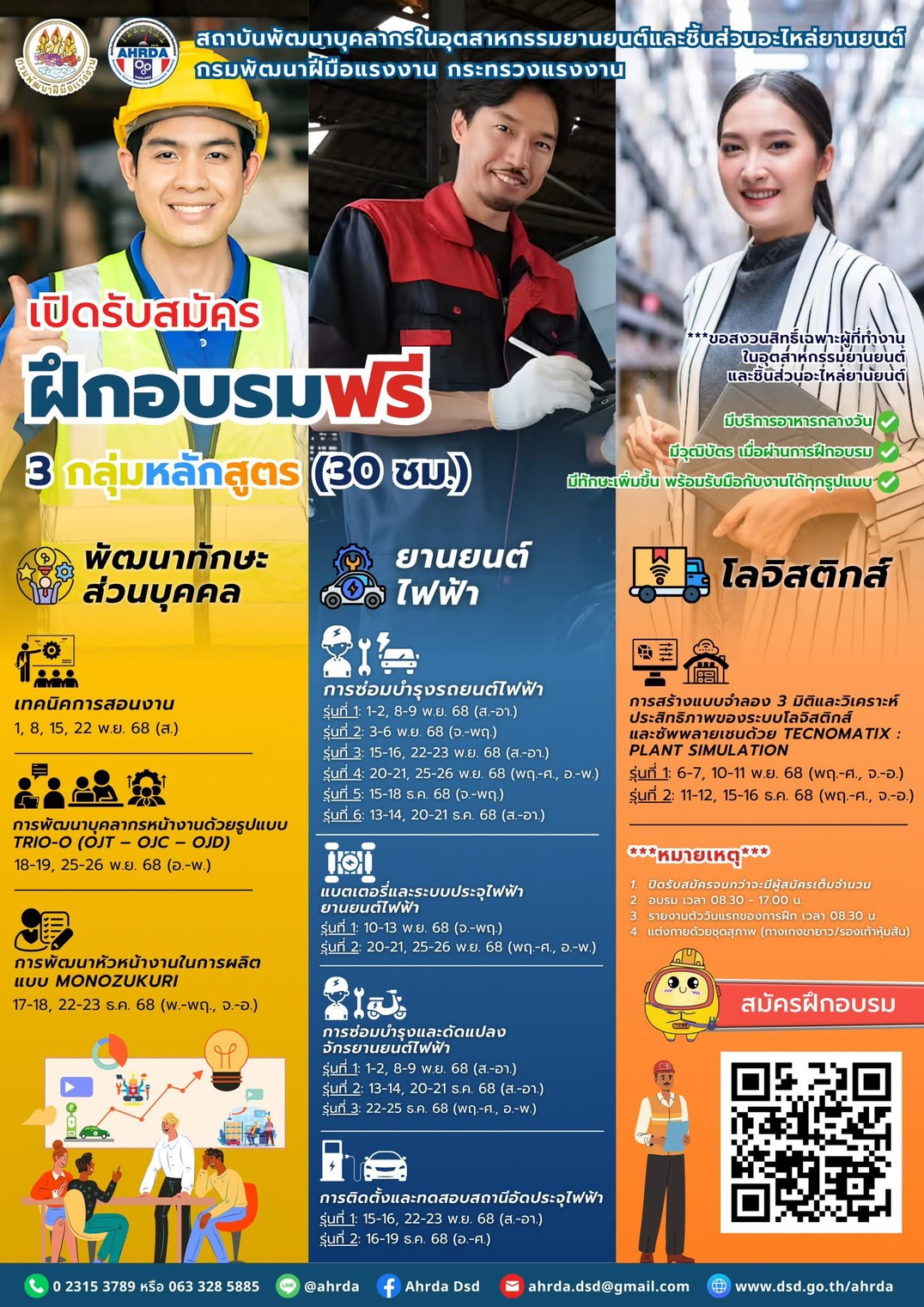 นายภัทรวุธ กล่าวต่อไปว่า ปี 2569 กรมพัฒนาฝีมือแรงงาน ตั้งเป้าฝึกอบรมในด้านดังกล่าว 15000 คน ซึ่งขณะนี้ สถาบันพัฒนาบุคลากรในอุตสาหกรรมยานยนต์และชิ้นส่วนอะไหล่ยานยนต์ (AHRDA) จ.สมุทรปราการ จะเปิดฝึกอบรมระหว่างเดือนตุลาคม จนถึงธันวาคม 2568 จำนวน 3 กลุ่มหลักสูตร 13 รุ่น ประกอบด้วย 1) กลุ่มพัฒนาทักษะส่วนบุคคล ได้แก่ หลักสูตรเทคนิคการสอนงาน หลักสูตร การพัฒนาบุคลากรหน้างานด้วยรูปแบบ Trio-O หลักสูตร การพัฒนาหัวหน้างานการผลิตแบบ Monozukuri 2) กลุ่มยานยนต์ไฟฟ้า ได้แก่ หลักสูตรการซ่อมบำรุงรถยนต์ไฟฟ้า หลักสูตรแบตเตอรี่และระบบประจุไฟฟ้ายานยนต์ไฟฟ้า หลักสูตรการซ่อมบำรุงและดัดแปลงจักรยานยนต์ไฟฟ้า หลักสูตรการติดตั้งและทดสอบสถานีอัดประจุไฟฟ้า 3) กลุ่มโลจิสติกส์ ได้แก่ หลักสูตรการสร้างแบบจำลองสามมิติและวิเคราะห์ประสิทธิภาพของระบบโลจิสติกส์และซัพพลายเชนด้วย Tecnomatrix plant simulation คุณสมบัติของผู้สมัครต้องเป็นผู้ที่ทำงานเกี่ยวข้องกับด้านอุตสาหกรรมยานยนต์และชิ้นส่วนอะไหล่ยานยนต์ สุขภาพแข็งแรง มีความพร้อมสำหรับการเรียนรู้ตลอดหลักสูตร ทั้งนี้ อบรมฟรี ไม่มีค่าใช้จ่าย มีอาหารกลางวันฟรีให้สำหรับผู้เข้าอบรม และเมื่อผ่านการฝึกอบรมจะได้รับวุฒิบัตรด้วย สามารถสมัครได้ที่ สถาบันพัฒนาบุคลากรในอุตสาหกรรมยานยนต์และชิ้นส่วนอะไหล่ยานยนต์ (AHRDA) โทร. 0 2315 3789 06 3328 5885 Line : @ahrda หรือ https://ahrda-recruit.my.canva.site/ หรือสแกน QR Code จากภาพด้านล่างได้เช่นกัน