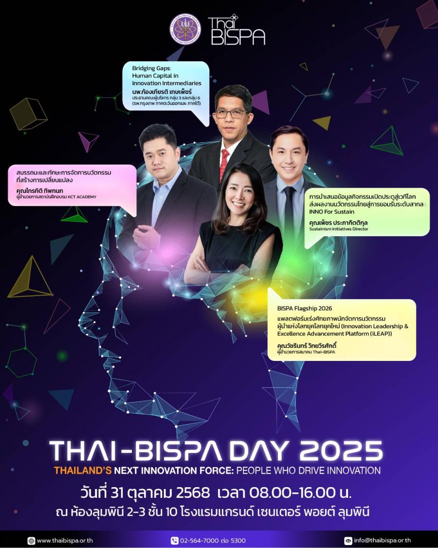 ขอเชิญทุกท่านร่วมเป็นส่วนหนึ่งภายในงานสุดยิ่งใหญ่แห่งปีกับงาน Thai-BISPA Day 2025 ปีนี้จัดขึ้นภายใต้แนวคิด “THAILAND’S NEXT INNOVATION FORCE: People Who Drive Innovation” งานรวมพลังเครือข่ายผู้ขับเคลื่อนนวัตกรรมจากทั่วประเทศที่มุ่งเน้นยกระดับศักยภาพ “คน” ในฐานะพลังสำคัญของระบบนิเวศนวัตกรรมไทย