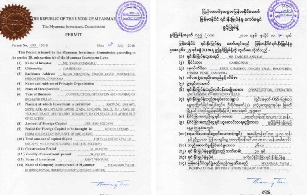 3) ได้รับการอนุญาตจากรัฐบาลเมียนมาร์ ผลักดันเมืองย่าไท่และยกระดับคุณภาพชีวิตพลเมืองอย่างถูกกฎหมาย