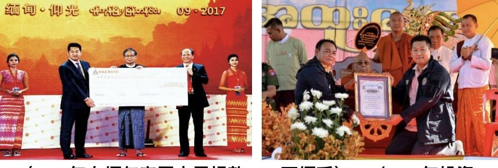 ภาพซ้าย: ปีพ.ศ. 2560 บริจาคเงินช่วยเหลือประชาชนในเขตภัยพิบัติประเทศเมียนมาร์เป็นจำนวน 20000000 จ๊าดเมียนมาร์
