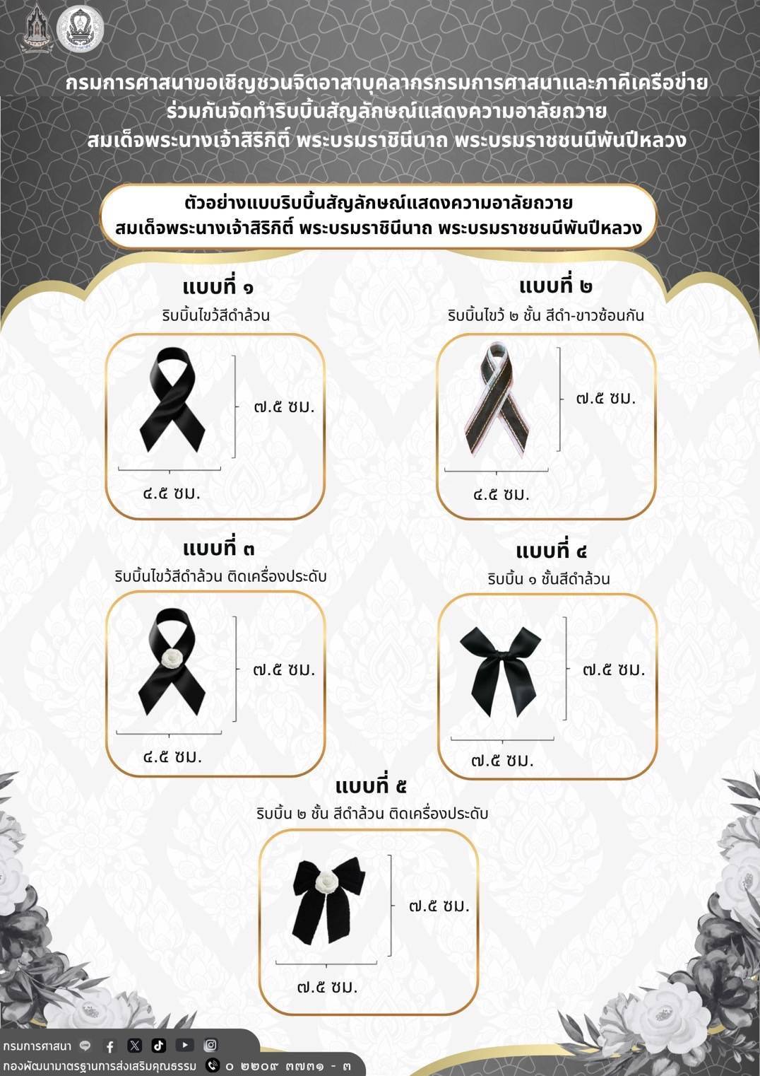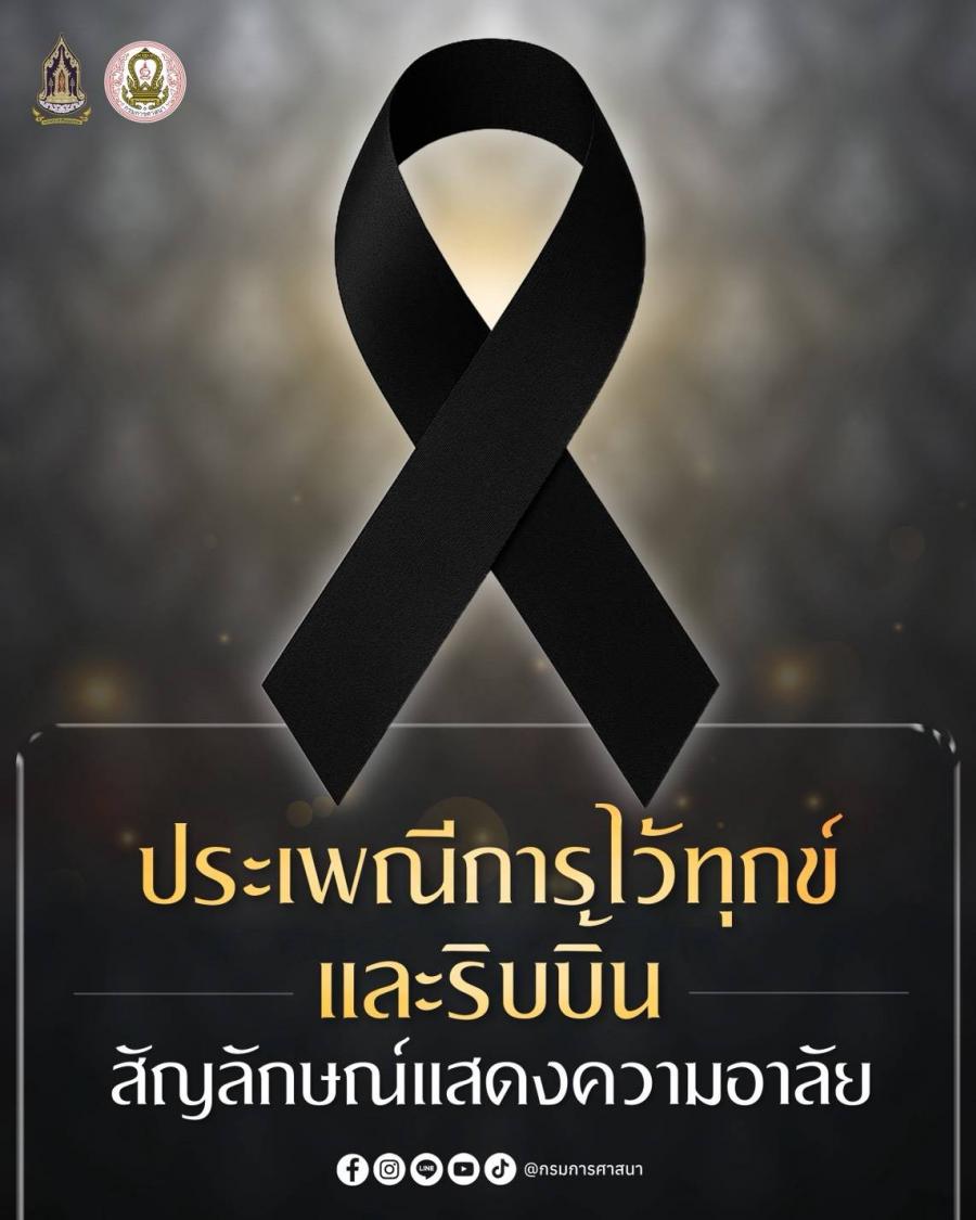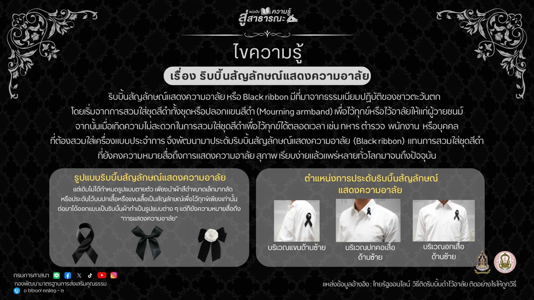 เกร็ดความรู้ด้านศาสนาในพิธีบำเพ็ญกุศล อุทิศถวายเป็นพระราชกุศลแด่สมเด็จพระนางเจ้าสิริกิติ์ พระบรมราชินีนาถ พระบรมราชชนนีพันปีหลวง เรื่อง... ประเพณีการไว้ทุกข์และริบบิ้นสัญลักษณ์แสดงความอาลัย โดย กรมการศาสนา กระทรวงวัฒนธรรม