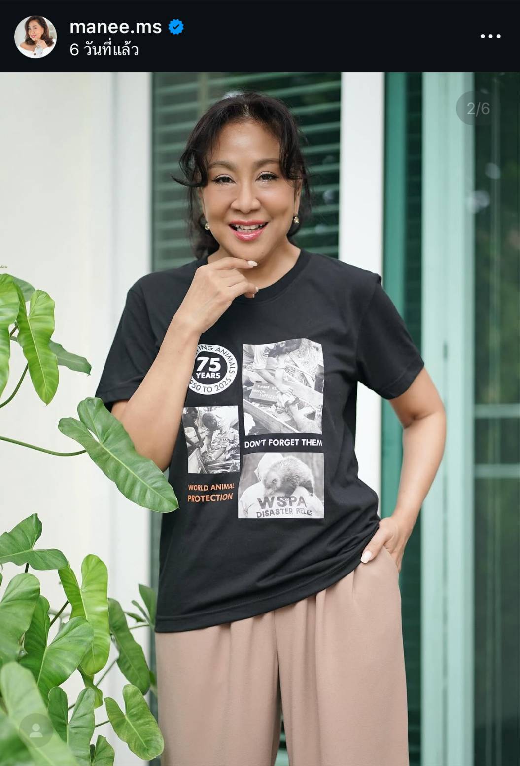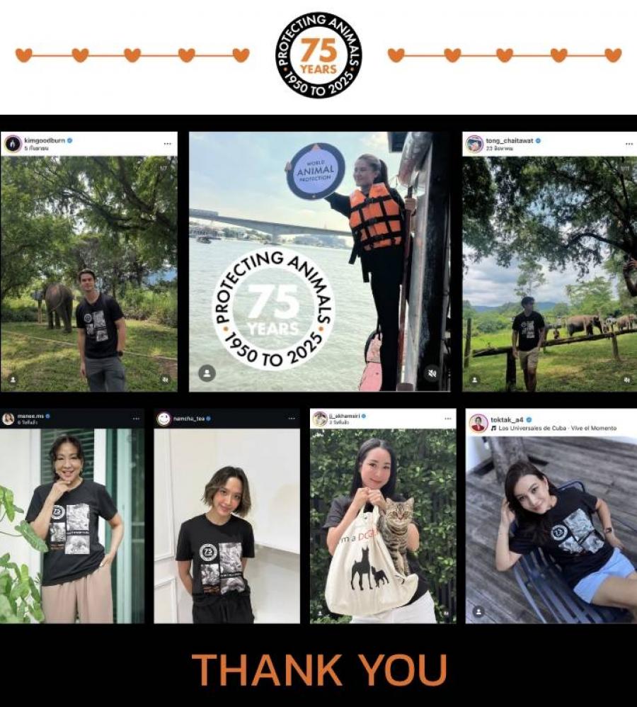 องค์กรพิทักษ์สัตว์แห่งโลกขอขอบคุณเหล่าศิลปิน ดารา-คนดัง พร้อมใจกันร่วมภารกิจเพื่อเพื่อนร่วมโลก ภายใต้แคมเปญ 75 ปี World Animal Protection โดยต่างสวมเสื้อยืดขององค์กรที่มีข้อความ “Don’t Forget Them” เพื่อร่วมเป็นพลังสำคัญในการส่งต่อเสียงแห่งความกรุณาครั้งนี้ เพื่อจุดประกายให้สังคมหันมาเห็นคุณค่าของชีวิตสัตว์ นำทีมโดย มารีญา พูลเลิศลาภ ทูตองค์กรฯ ประเทศไทย พร้อมด้วยนักแสดงและเหล่าคนดังหลากหลายวงการ อาทิ คิม-ธิติสรรค์ กู้ดเบิร์น Mister International 2023 พิธีกร นักแสดง น้ำชา-ชีรณัฐ ยูสานนท์ ครูอ้วน มณีนุช เสมรสุต ต่าย-เพ็ญพักตร์ ศิริกุล ตั๊ก-มยุรา เศวตศิลา แพนเค้ก-เขมนิจ และมิกิ-อิงกมล จามิกรณ์ จั๊กจั่น-อคัมย์สิริ สุวรรณศุข เต๋า-เศรษฐพงศ์ เพียงพอ ฌอน-ชวนล ไคสิริ ดีไซเนอร์แบรนด์ POEM หนูดี วนิษา เรซ แม็กซีน อินทิพร แต้มสุขิน แซมมี่ เคาวเวลล์ ต๋อง-ชัยธวัช ไพศาลศิริ ใบตอง-จรีรัตน์ เพชรโสม Miss Earth Thailand 2021 ต๊อกแต๊ก A4 และเหล่าอินฟลูเอนเซอร์สายกรีน อาทิ ฟิล์ม เพจ Smile bear พิม เพจ Green Civil หวาน เพจ Vegan Calendar เป็นต้น