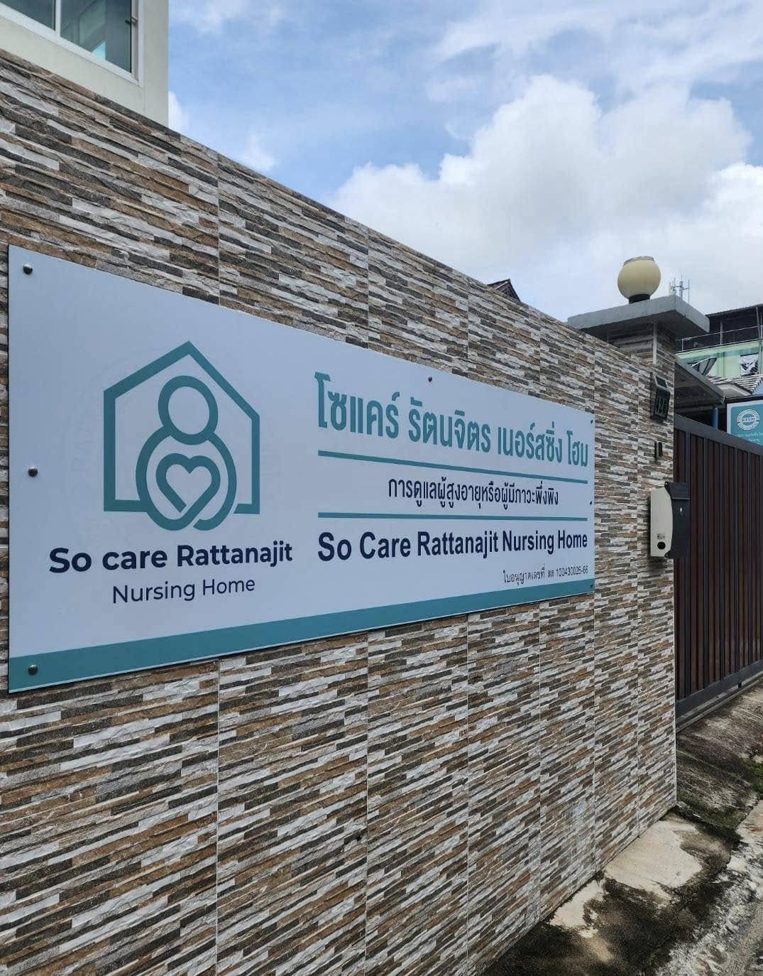 ศูนย์ So Care Rattanajit Nursing Home ตั้งอยู่ใน ซอยลาดพร้าว 109 แยก 7 รายล้อมด้วยต้นไม้สีเขียว สะอาด ปลอดภัย พร้อมสิ่งอำนวยความสะดวกครบครัน ให้บริการโดยทีมสหวิชาชีพตลอด 24 ชั่วโมง ทั้งแบบห้องรวมและห้องพิเศษ รองรับผู้สูงอายุที่ต้องการพักระยะสั้นหรือระยะยาว โดยศูนย์ฯ มุ่งเน้นการดูแลผู้สูงอายุ ผู้ป่วยติดเตียง และผู้ที่ต้องการการฟื้นฟูสุขภาพแบบองค์รวม โดยมีทีมพยาบาล นักกายภาพบำบัด และนักจิตวิทยาพร้อมให้บริการอย่างอบอุ่น