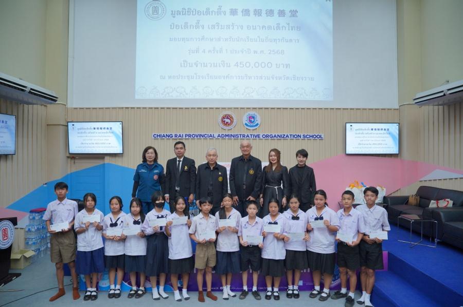 วานนี้ (วันจันทร์ที่ 24 พฤศจิกายน พ.ศ. 2568) มูลนิธิป่อเต็กตึ๊ง นำโดย นายสุรพงษ์ เตชะหรูวิจิตร กรรมการและรองเลขาธิการ พร้อมด้วย นายนิพนธ์ ลีละศิธร กรรมการ และนางสาวดวงชุตา ติยะพจนพรกุล ผู้ช่วยผู้จัดการฝ่ายสังคมสงเคราะห์ นำทีมแผนกส่งเสริมการศึกษาและอาชีพลงพื้นที่จังหวัดเชียงราย มอบทุนการศึกษาในระดับมัธยมศึกษาแก่นักเรียนในถิ่นทุรกันดาร รุ่นที่ 4 ครั้งที่ 1 ประจำปี 2568 ซึ่งเป็นการมอบทุนฯ ในรูปแบบต่อเนื่อง 3 ปี รวมจำนวน 60 ทุน รวมงบประมาณทั้งสิ้น 450000 บาท (สี่แสนห้าหมื่นบาทถ้วน) โดยมี นายวีระยุทธ คีลาวงค์ รองผู้อำนวยการโรงเรียนองค์การบริหารส่วนจังหวัดเชียงราย พร้อมด้วยผู้บริหารสถานศึกษา อีก 20 แห่ง คณะครู อาจารย์ และผู้แทนนักเรียนจากโรงเรียน ร่วมในพิธี ณ หอประชุมโรงเรียนองค์การบริหารส่วนจังหวัดเชียงราย อำเภอเมือง จังหวัดเชียงราย