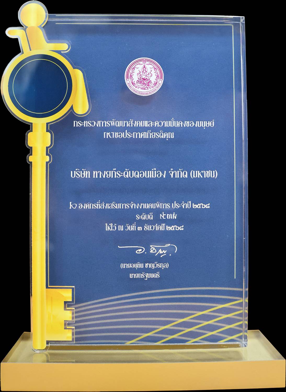 บริษัท ทางยกระดับดอนเมือง จำกัด (มหาชน) (DMT) เข้ารับประกาศเกียรติคุณรางวัล “องค์กรที่ส่งเสริมการจ้างงานคนพิการ ประจำปี 2568 “ ระดับดี ” จากกรมส่งเสริมและพัฒนาคุณภาพชีวิตคนพิการ ร่วมกับสมาคมคนพิการทุกประเภทแห่งประเทศไทย องค์กรคนพิการแต่ละประเภท และภาคีเครือข่าย ทุกภาคส่วน ซึ่งจัดขึ้นในงานวันคนพิการสากล ประจำปี 2568 เมื่อวันที่ 3 ธันวาคม 2568 ณ ห้องรอยัล จูบิลี บอลรูม อิมแพ็ค เมืองทองธานี จังหวัดนนทบุรี
